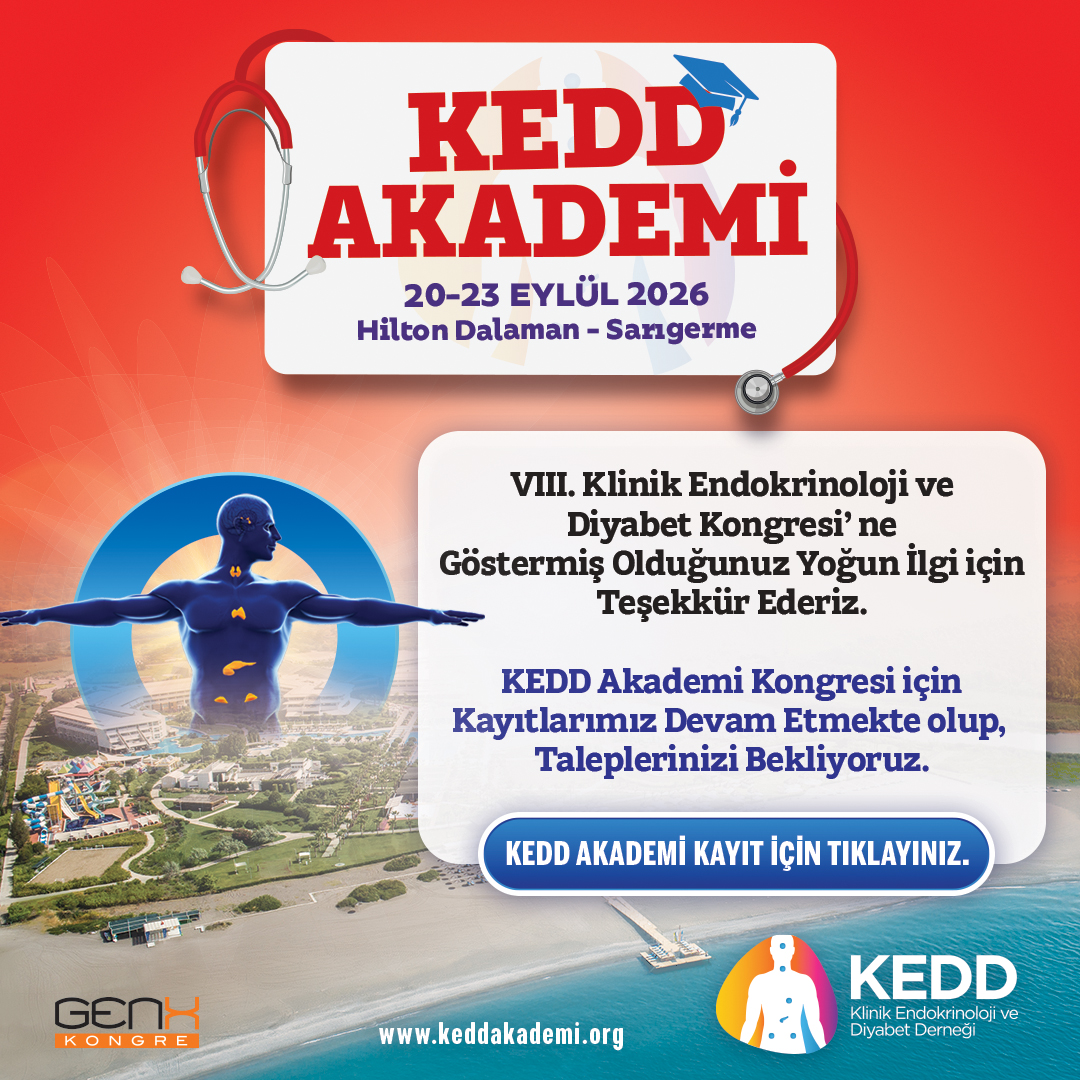 Bu yıl Sekizinci Klinik Endokrinoloji ve Diyabet Kongresi’ni 23-27 Eylül 2026 tarihleri arasında yine Muğla, Sarıgerme Hilton Dalaman Otel’de yapacağız. Bilimsel programda Endokrinoloji, Metabolizma Hastalıkları ve Diyabet alanında klinik yaklaşımlar ile güncel konular ve gelişmeler yer alacaktır.